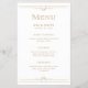 Este glamuroso menú boda presenta un moderno giro en la decoración clásica de arte. Bordes geométricos y ornamentación de color blanco elegante decoran los bordes ornados y falsos de oro para una cena espectacular y vintage de los años 20.