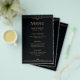 Este glamuroso menú boda presenta un moderno giro en la decoración clásica de arte. Bordes geométricos y ornamentación de color dorado oscuro y elegante en un marco negro anónimo para una cena de estilo dramático y vintage de los años 20.