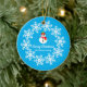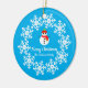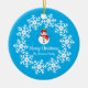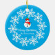 Imagen de un muñeco de nieve sobre un copo de nieve y fondo azul.
