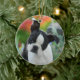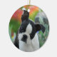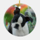 Un perrito femenino lindo joven de Boston Terrier, negro con las marcas blancas, en un jardín florido. Los terrieres de Boston, también llamados los toros de Boston o los "caballeros americanos", son una raza apacible, amistosa e inteligente del perro para el compañerismo. El perrito perrito-observado fue fotografiado por Katho Menden, este navidad redondo de cerámica que el ornamento es una idea encantadora del regalo para los doglovers. http://www.zazzle.com/kathom_photo