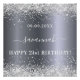 Un poster para una fiesta de cumpleaños glamurosa y femenina de 21 años (o de cualquier edad). Un falso fondo plateado con elegantes purpurinas de plata falsa, chispas. El texto: El nombre está escrito en blanco con una escritura de estilo moderno con letras a mano con groserías. Para que los cambios sólo eliminen el nombre del ejemplo, deje los espacios o la emoji delante y después del nombre. Personalice y agregue un nombre, edad 21 y fecha.