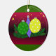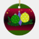 Un diseño de bonito con adornos navideños coloridos sobre un lecho de ramos de pino. Un fondo rojo y verde lo acentúa.