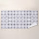 Two images showing a matching towel and washcloth set with a blue geometric pattern on a white background. The towel hangs on a silver rod, and the washcloth is folded with one corner turned up, showcasing its design."