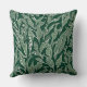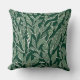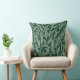 Este cojín tiene un diseño moderno y sofisticado, con un patrón de hojas naturales pintado de blanco sobre un fondo verde.