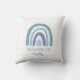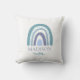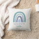 La almohada decorativa presenta un diseño encantador y minimalista. En el centro, hay un arcoíris en forma de semicírculo compuesto por cinco bandas curvas en tonos de azul y verde turquesa. Debajo del arcoíris, el nombre personalizado está escrito en una fuente suave y cursiva en un color verde turquesa a juego. A la derecha del nombre, hay una pequeña ramita de hojas en el mismo tono de verde turquesa, lo que añade un toque delicado al diseño. La apariencia general es simple, moderna y personalizada, con una paleta de colores tranquilizadora.