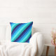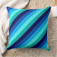 Una almohada de 20" x 20" con un diseño de patrón fresco de rayas diagonales en azul marino, azul cobalto, azul celeste, verde azulado de menta helada y turquesa clara.