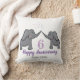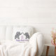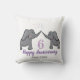 Sencillo cojín de aniversario boda personalizado en color morado y blanco con una pareja de elefantes.