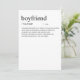 Agrega un toque de humor y estilo a tu regalo del Día de San Valentín con esta divertida tarjeta de "Definición de Novio". Con tipografía ingeniosa y minimalista y un diseño limpio, transmite un mensaje divertido y ligero que seguramente hará sonreír a tu pareja. También hay un espacio en blanco donde puedes incluir tu mensaje manuscrito personalizado para él. ¿Quieres agregar una característica ingeniosa y personalizada a la definición? Contáctame en: shahirah.creates92@gmail.com, y la haré única para ti.