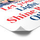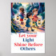 Un ilustracion acuático de niños sosteniendo farolillos y caminando por un bosque al atardecer. Los niños caminan por un camino bordeado de piedras. El bosque está lleno de árboles altos con troncos cubiertos de musgo. El suelo está cubierto de hojas. El cielo está lleno de suaves tonos naranjas y morados. Un verso "Deja que tu luz brille antes que los demás" está escrito en la parte inferior.