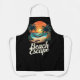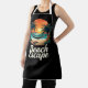 Una mujer modela un delantal blanco con un gráfico de estilo vintage de una escena playera al atardecer, con palmeras, una hamaca y sandalias, y el texto "Beach Escape" debajo.