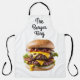 Apron del chef con una imagen de una gran hamburguesa y las palabras "El Rey hambriento"