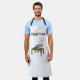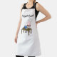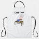 Este delantal tiene mi dibujo personalizado de un chef mezclando algo en un recipiente. Está parado detrás de una mesa y lleva puesto un chef gorra y un delantal.