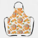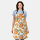 Aprón de impresión todo-sobre de naranja Jam. Jar lleno de mermelada Naranja rodeada de naranjas, rodajas naranjas y patrón de hojas verdes sobre un fondo blanco.