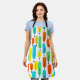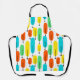 Este delantal tiene un diseño moderno de mediados de siglo de ovarios largos en amarillo, naranja, verde y turquesa con líneas negras con círculos en los extremos.