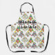 Este delantal adulto tiene un diseño moderno de mediados de siglo de árboles navideños de diferentes estilos. Una tiene una rejilla con rectángulos con estallidos en el interior. Otro tiene rectángulos redondeados con rectángulos más pequeños dentro. Un tercio tiene líneas curvas con estrellas sobre ellas. El árbol final es un triángulo con otros triángulos más pequeños dentro.