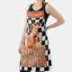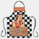 Diseño vintage de Guay, arte gráfico, con una mujer con gran efecto de texto Reina de la casa y patrón a cuadros en blanco y negro. Un diseño único con texto personalizado, bello contraste, negro, blanco y naranja.