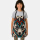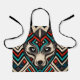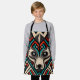 Se trata de una cara decorativa de lobo hecha a mano y estilizada con estampados aztecos en colores negro, rojo, turquesa y beige.