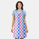 A checkerboard pattern of pink, blue, and white squares creates a vibrant and lively visual effect, conveying playfulness and energy.