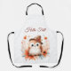 Una lechuza adorable con un gorra de temática otoñal decorado con bayas se sienta en una rama junto a una flor naranja y rodeada de hojas de otoño.