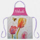 Patrón de pintura de color pastel floral Tulipán rosa y agua de abeja Apron de cocina femenina, con un nombre de personalizable completo. Diseñado desde mi ilustracion original de gatos.