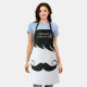 Un delantal divertido y moderno con el pelo negro y un bigote imperial con fondo blanco. La parte superior está decorada con tijeras blancas y es personalizable con el nombre de tu tienda en un estilo moderno y blanco. Hace el delantal perfecto para los empleados de la barbería.