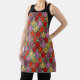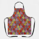 Este delantal tiene un diseño art deco de tulipanes de pentagones y trapezoides en naranja, rojo, púrpura, dorado y verde.