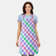 A vibrant checkerboard pattern featuring alternating pastel purple, pink, and green squares against a white background, creating a playful, colorful effect.