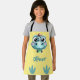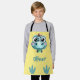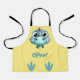Este delantal personalizado de cara de dinosaurio bebé súper lindo presenta un dino de dibujos animados azul alegre con ojos grandes, mejillas sonrosadas y manchas juguetonas y sus huellas.