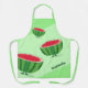 Un delantal que muestra tres personajes de dibujos animados sonrientes sobre una sandía de fondo verde con una palabra de personalizable en verde oscuro. Puede cambiar la palabra por un nombre o una frase corta.