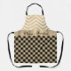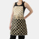 En este elegante delantal hay un patrón de chevron dorado y blanco en la parte superior y luego una brillante cinta dorada donde se puede personalizar para hacerla única, propia y por debajo, que es una impresión a cuadros de gingham negro y marrón para completar este clásico delantal.