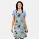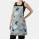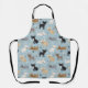 Cute chihuahua dogs in black, brown, tan, cream, gray and blue coats sit and stand scattered dog bones and paw prints on a light blue background.