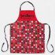 Personaliza este diseño moderno de círculos gráficos en forma de delantal en tonos rojos, grises, blancos y negros sobre un fondo rojo. Selección de colores de fondo y correa, así como opciones de estilo de fuente y color.