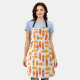 Este delantal tiene un patrón repetido de ovales en naranja retro y amarillo con ovales blancos dispersos todo sobre un campo de blanco.