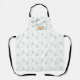 Cookies and cocoa gender neutral apron with gray snowflakes and winter green trees bordering a plate of chocolate chip cookies and a mug of hot chocolate