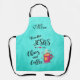 ¡Personalice este cómico "Apron de una mujer cristiana"! En él se pueden leer las palabras cómicas cristianas..."Corro sobre Jesús, caos y café" y una hermosa jarra de café caliente rodeada de flores y corazones en un fondo turquesa. Diseño original de arte gráfico por el artista Kerry Miller.