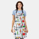 Este delantal tiene un diseño moderno de mediados de siglo de una gran cuadrícula de líneas negras horizontales y verticales con rectángulos coloridos.