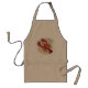 Delantal de bib del chef con bolsillos delanteros. Una sola imagen de langosta roja se coloca sobre un diseño de tablero de ajedrez bronceado con borde irregular de pinceladas. Se muestra en un delantal bronceado caqui, con blanco o amarillo disponible. El texto del "Chef" está en letra cursiva azul oscuro y se puede cambiar o eliminar.