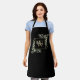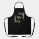 Delantal elegante con monograma de nombre de hojas de verde acuarela floral con una inicial de monograma de oro en un fondo negro con su nombre puesto en una elegante escritura blanca. Diseñado por Thisisnotme©