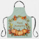 Este delantal es perfecto para la temporada de feriados de Acción de Gracias. Las calabazas, las flores caídas y las hojas añaden calidez y color.