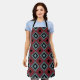 Este delantal tiene un diseño art deco de formas diamantíferas con líneas diagonales, diamantes negros y diamantes de colores en tonos azules y arándanos.