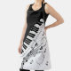 Teclado clásico blanco y negro con un toque curvo. Las notas musicales agregadas le dan un aspecto festivo.