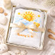 Una encantadora ilustración con tema de sol radiante que presenta un sol dorado sonriente que se eleva sobre nubes azules esponjosas con pequeñas estrellas brillantes y un osito de peluche dulce sentado entre las nubes. La paleta de acuarela cálida y el suave estilo de guardería crean una atmósfera alegre perfecta para celebraciones de bebés. Este diseño juguetón destaca el papel especial de la futura mamá y añade un toque brillante y alegre a las fiestas de baby shower y las fotos de celebración.