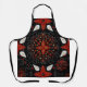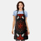 Intricate black background with a symmetrical floral pattern in red, white, and gold. Curved lines and dots add detail, creating an elegant, festive feel.