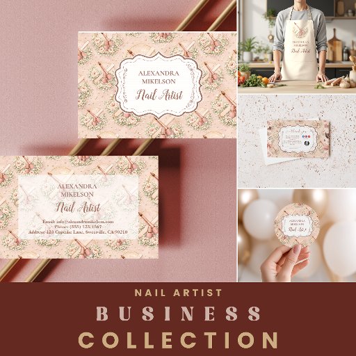 An elegant and feminine business design featuring delicate blush florals combined with stylish nail polish illustrations. The soft vintage-inspired palette and romantic botanical details create a luxurious beauty aesthetic perfect for modern nail artists and beauty professionals. The refined frame and floral elements give the design a boutique, high-end feel that works beautifully for salons, nail technicians, and independent beauty businesses. Ideal for creating a polished and memorable first impression for your beauty brand.