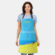 Este práctico delantal tiene una huella de Benaulim Beach en Goa, India con las palabras "En la playa en Goa". Puedes personalizarlo con tus palabras y tu nombre. La impresión es una manipulación fotográfica estilizada, y muestra la inmensa playa de amarillos brillantes contra un mar y cielo azul turquesa. El arco de un barco local con cuentas está a la derecha y se pueden ver vacas y ciclistas en la playa. Es adecuado para cualquier persona usar.