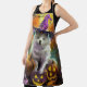 Admire el espíritu de Halloween con este diseño encantador que presenta un perro lindo en un gorra de brujas rodeado de calabazas talladas. Perfecto para añadir un toque de encanto espeluznante a sus celebraciones festivas.