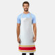Este diseño deportivo presenta rayas flotantes amarillas doradas que resaltan la franja de borde inferior horizontal de color rojo brillante contra un fondo blanco.