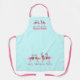 Flamingos bib delantal con texto rosa sobre azul pálido. Utilícelo para una cocina de negocios o una casa costera. Cuatro flamencos en la parte superior del delantal y cuatro flamencos más grandes en la línea de cáñamo. Llevan coronas florales y se alinean entre pequeñas estrellas azules del mar. Las corbatas rosas coinciden con los flamencos, o cambia el color como quieras.