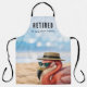 Put a smile on someone's face with this unique and funny retirement-themed apron. The design features a bright colorful flamingo wearing a hat and sunglasses on the beach with the ocean in the background. The text reads, "RETIRED... not my problem anymore." The apron is available in three size options. It is perfect for a retirement gift, Grandparent's Day gift, gift for a special relative, neighbor, friend, boss, coworker, or anyone enjoying retirement. Please browse our complete collection of flamingo retirement gifts, cards, t-shirts, home decor, and more! Special design requests accepted.