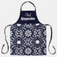 Agregue este diseño floral elegante, festivo y folclórico nórdico a sus accesorios de cocina. El diseño de este delantal es simple pero decorativo y festivo, con detalles florales y botánicos delicados que siguen un patrón de baldosas básico. Un fondo azul marino sólido en la parte superior del delantal para la legibilidad de la tipografía personalizable. Inspirado en el estilo de arte popular nórdico.